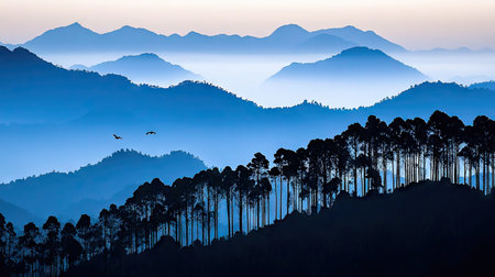 Tranquil landscape of a mountain range, painted in shades of blue, with a dense forest of trees in silhouette along the lower slopes. Misty layers create depth and atmosphere, and two birds are visible in flight above the peaks.