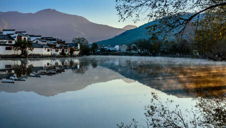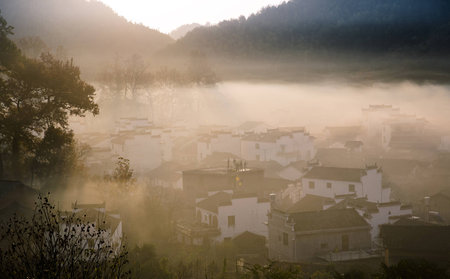 The morning fog on the dwellings of Anhui buildings in Wuyuan county Jiangxi province, China.