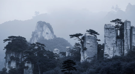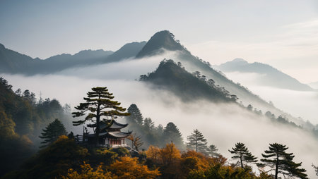 Misty mountain landscape soft fog hues embracing towering peaks in nature s serenity