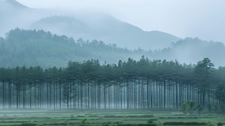 Terraced fields create striking patterns on a misty mountainside. Pine trees rise amidst the fog adding to the serene atmosphere of this tranquil rural area.