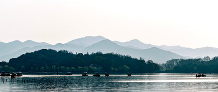 Landscape view of lake and mountains in the morning, Hangzhou, China