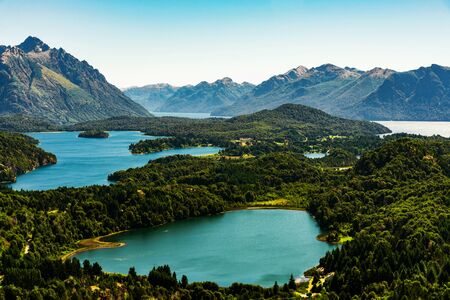 Landscape of blue lakes, Andes mountains, and forest in Patagonia, Argentina.