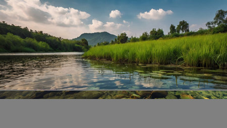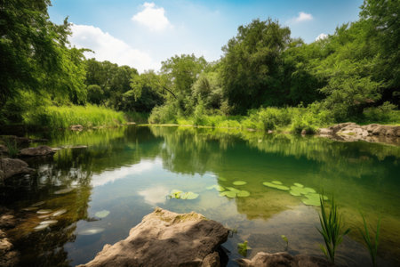 farm pond surrounded by lush greenery and clear waters, created with generative ai