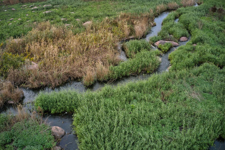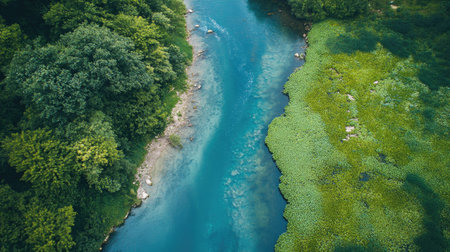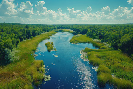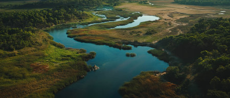 A breathtaking aerial view showcasing a vibrant river winding through lush wetlands. The scene captures the essence of natural beauty and serene landscapes filled with rich greenery and wildlife.