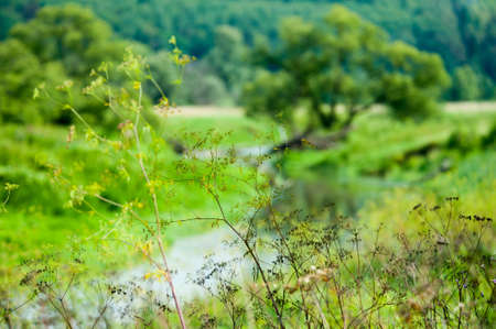 Landscape of a narrow river in Russia Focus to the grass on the foreground