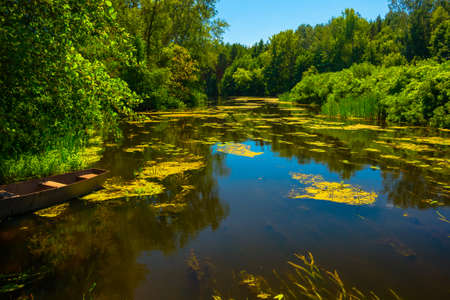 beautiful fabulous place among the trees. pond with moss and green grass.
