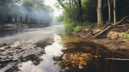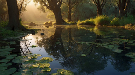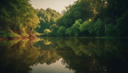 The tranquil scene of the forest at dusk, reflected in water generated by artificial intelligence