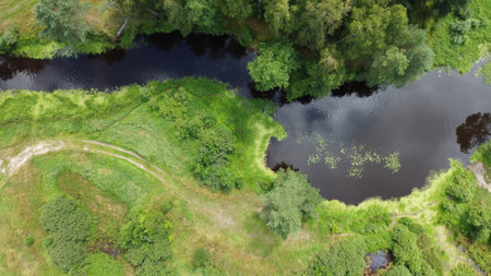 View from above of the countryside and river on a sunny day. Nature landscape with a beautiful cloudy sky. Summertime