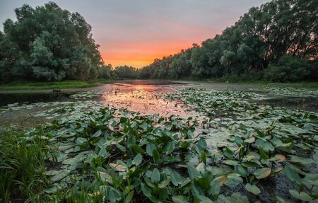 River in the forest at sunset. Beautiful natural landscape with river and trees