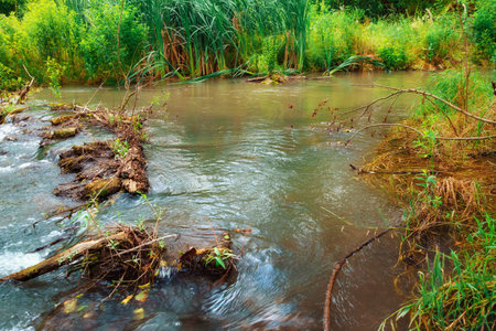 Forest river in the morning. Nature composition. Shallow depth of field.