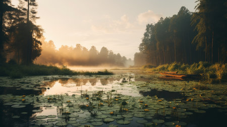 Peaceful swamp scene at sunset. Calm water reflects the surrounding greenery.
