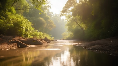 a small river in a wild forest, a beautiful summer landscape, bright sunlight through the trees reflected in the water