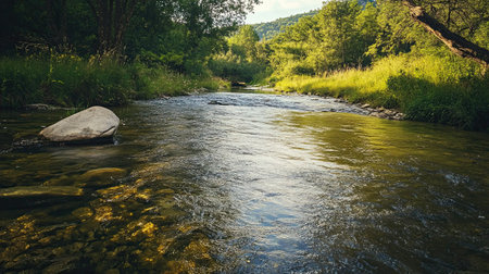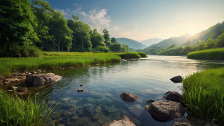 A tranquil mountain river flows gently, reflecting the sun's rays as a fisherman casts a line, surrounded by lush greenery.