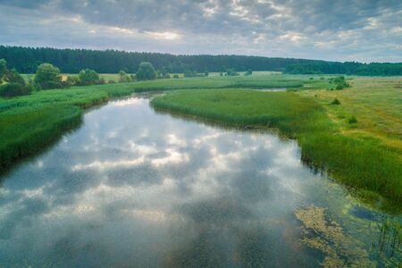 Aerial view of countryside and brook in the evening at sunset light. Beautiful rural nature landscape with evening bright sky