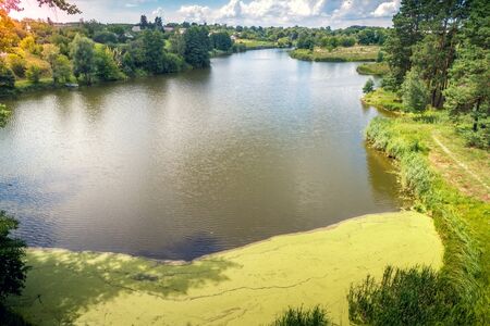 Beautiful sunny summer landscape. Blue sky and white fluffy clouds, green trees and wild grass, pond or lake water background. Horizontal color photo.