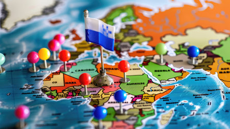 Close-up of colorful pushpins on a vintage world map, symbolizing travel planning and exploration. Shadows add depth to the geographic details.
