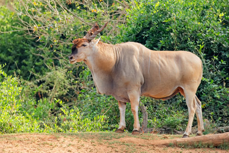 Wild african life. Close up of the Greater Eland (woodland antelope) standing in African bushes.