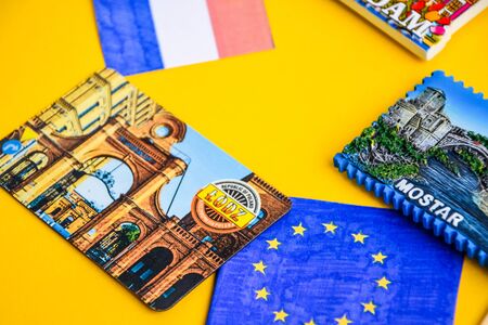 Poland travel destination, polish flag, magnets from Lodz, world map, travel concept, EU