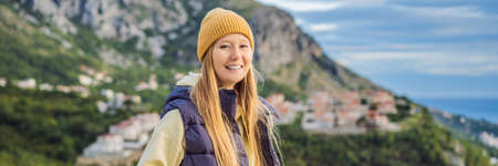 BANNER, LONG FORMAT Woman in the mountains of Montenegro in warm clothes. Travel to Montenegro in spring, autumn, winter