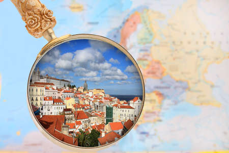 Looking in on Lisbon, Portugal with European map in the background