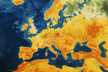 Satellite map illustrates the summer heat on the European continent World map with weather forecast illustration showing different climatic conditions