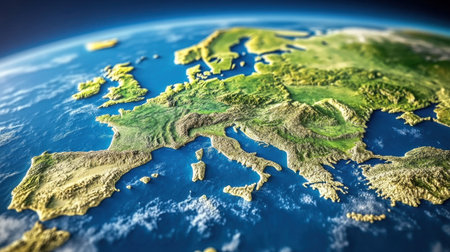 This vibrant 3D rendering presents Europe from a satellite perspective, highlighting diverse geographical features, captivating landscapes, and intricate coastal lines.