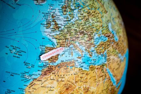 Planetary image Covid-19 map of Spain Coronavirus contagion causing epidemic or threat. Spanish 2019 2020 ncov outbreak and covid19 contagion. Globe view from space
