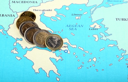 Europe helps Greece: euro coins on the map of Greece