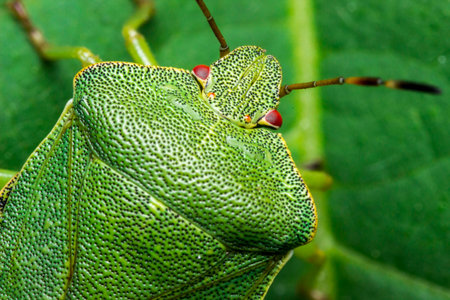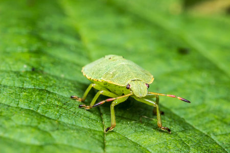 Closeup of an adult green shield bug (Palomena prasina, Pentatomidae) sitting on a green leaf