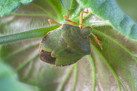 a tree bug sits on a green leaf. close-up. macrophotography. bug. chinch .Acanthosomatidae. Palomena prasina.