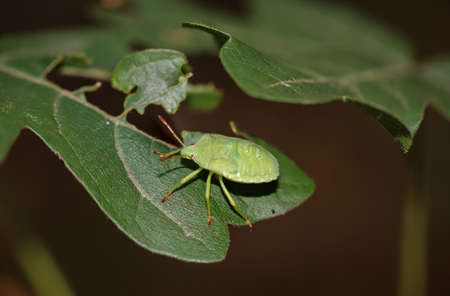The green shield bug or Palomena prasina from the family Pentatomidae close-up. Macro photo of a green beetle on an oak leaf.