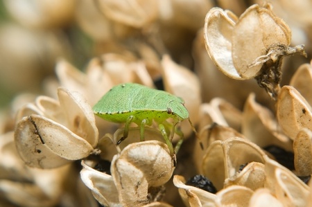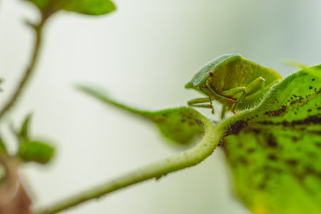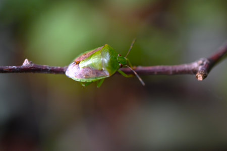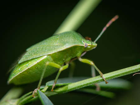 Southern green stink bug, nezara viridula sit on plant in forest, macro toned photo