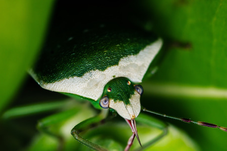 Close up of Green Shield bug insect on the edge of the leaf. Used selective focus.