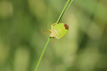 Green Shield bug on the edge of the leaf. Used selective focus.