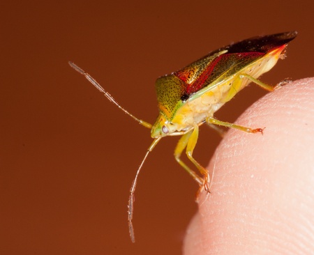 A woman holds a spined green stink bug in the Family Pentatomidae, scientific name - Loxa flavicollis.