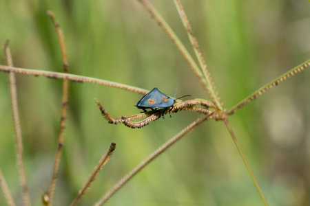 Selective focus Macro image of a jewel bug with vibrant colors walking on a stem with blur green background