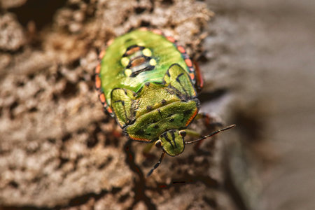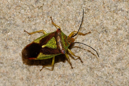 A macro close up of a Hawthorn Shield Bug resting on a stone wall