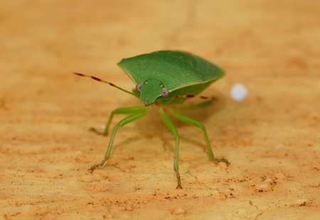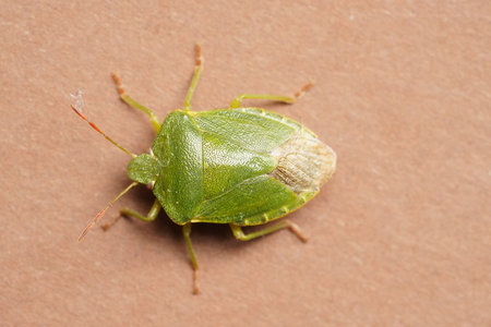 A closeup shot of a green stink bug (Palomena prasina) on a brown surface