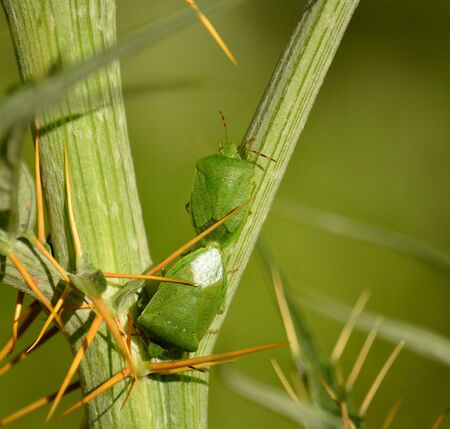 Couple of small green bugs in mating ritual among branches of wild artichoke, Nezara viridula