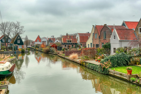 Volendam - traditional dutch historical village on Markermeer lake near Amsterdam, North Holland, Netherlands. Some pretty houses with mirror reflection in water. A popular tourist destination