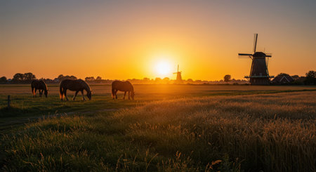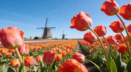 A creative digital illustration depicting Vibrant tulip fields under blue sky with windmills, expansive wide-angle composition, bright midday sunlight, Dutch countryside photo style, joyful blooming mood, professional high-res image.. This AI-generated artwork features unique visual elements suitable for various commercial and editorial applications. AI-generated illustration.