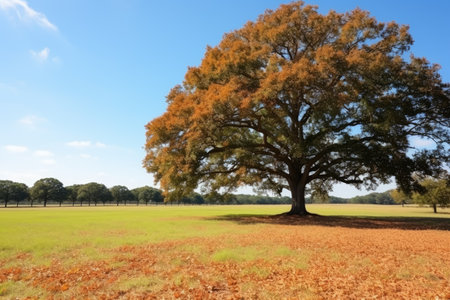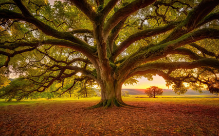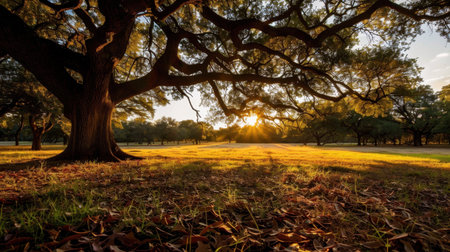 Majestic oak tree branches stretch across sunlit meadow, with golden sunlight filtering through leaves, creating serene and tranquil atmosphere. ground is covered with fallen leaves, enhancing