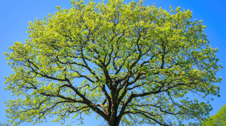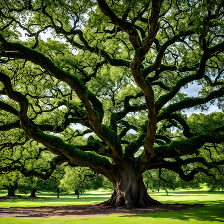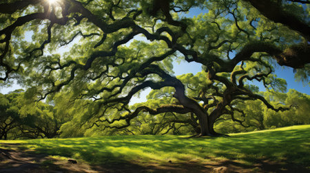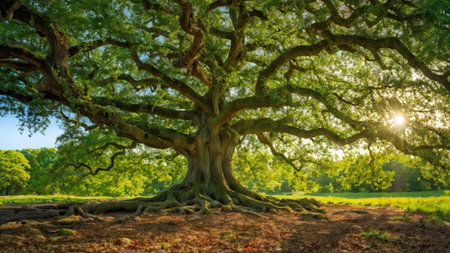 A stunning display of an ancient tree with expansive branches and vibrant green leaves. The serene atmosphere captures the essence of nature's beauty and tranquility.