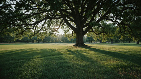 Large oak tree with sprawling branches in a tranquil park setting. Sunlight filters through the leaves, creating long shadows on the lush green grass.