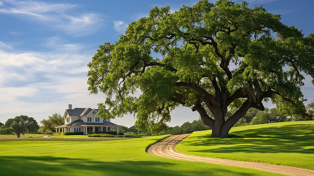 Beautiful oak trees on green field under blue sky with white clouds