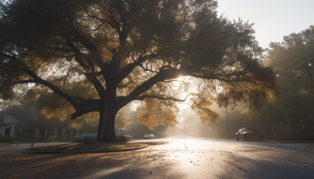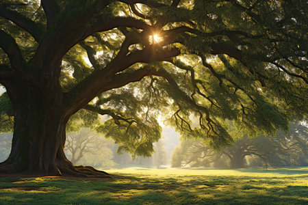 sunrays filtering through oak tree branches, created with generative ai