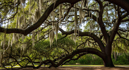 Old oak tree with Spanish moss in the park in springtime.
