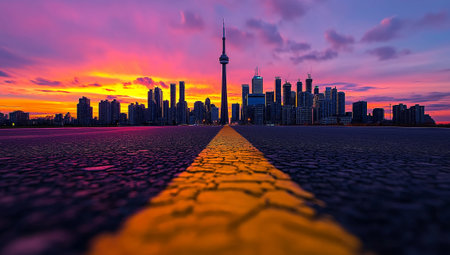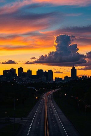 A highway leading to city skyline at sunset, showcasing vibrant colors and dramatic clouds. scene captures essence of urban life and natural beauty