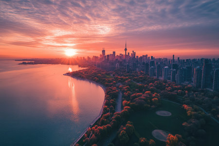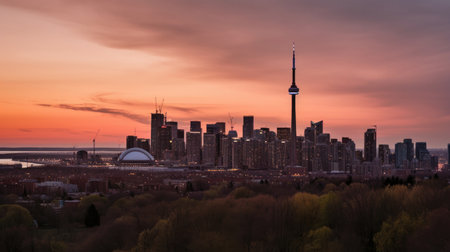Panoramic view of the beautiful Toronto skyline at sunset, featuring the city's iconic buildings and landmarks. The CN Tower stands tall amidst the colorful sky and reflects on the calm waters of Lake Ontario. This stunning image captures the vibrant energy of Toronto, a modern and diverse metropolis in Canada.