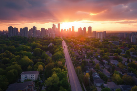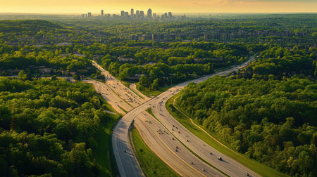 Capture a stunning aerial perspective featuring a vibrant urban skyline, lush greenery, and a lively highway filled with traffic, showcasing the beauty of metropolitan life at sunset.